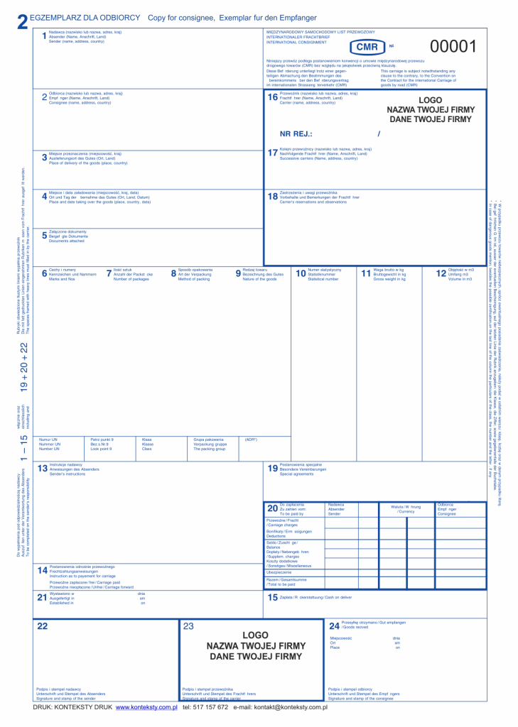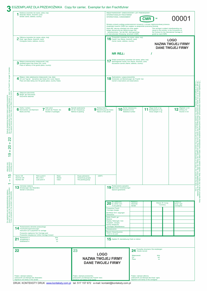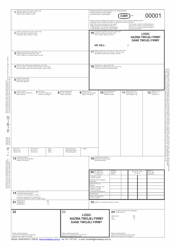 Wydruk bloczków CMR (międzynarodowy list przewozowy) z pełną personalizacją, logo firmy oraz numeracją. Bloczki 100 kart, kolor, 1+3 kopie, 1+4 kopie, 1+5 kopii.